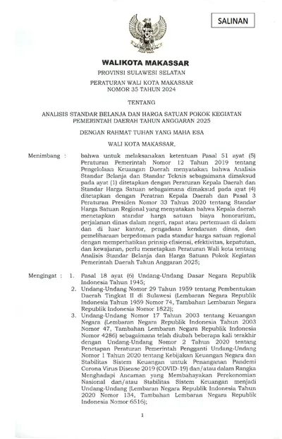 Peraturan Walikota Makassar Nomor 35 Tahun 2024 Tentang Analisis Standar Belanja Dan Harga Satuan Pokok Kegiatan Pemerintah Daerah Tahun Anggaran 2025