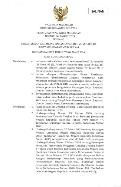 Peraturan Walikota Makassar Nomor 36 Tahun 2024 Tentang Pengelolaan Keuangan Badan Layanan Umum Daerah Pusat Kesehatan Masyarakat