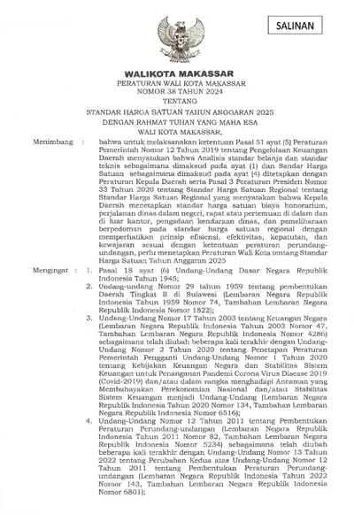 Peraturan Wali Kota Makassar Nomor 38 Tahun 2024 Tentang Standar Harga Satuan Tahun Anggaran 2025
