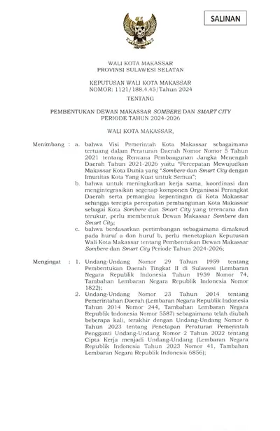 Keputusan Walikota Makassar Nomor 1121/188.4.45/tahun 2024 Tentang Pembentukan Dewan Makassar Sombere Dan Smart City Periode Tahun 2024-2026