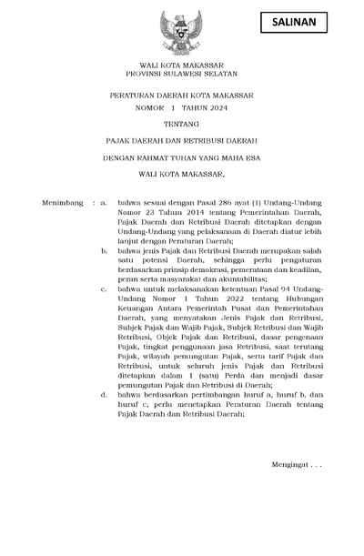 Peraturan Daerah Kota Makassar Nomor 1 Tahun 2024 Tentang Pajak Dan Retribusi Daerah