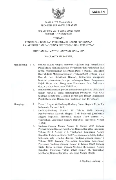 Peraturan Walikota Makassar Nomor 4 Tahun 2024 Tentang Penetapan Besaran Persentase Dasar Pengenaan Pajak Bumi Dan Bangunan Perdesaan Dan Perkotaan
