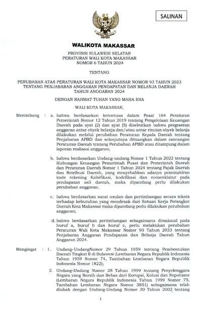 Peraturan Wali Kota Makassar Nomor 6 Tahun 2024 Tentang Perubahan Atas Peraturan Wali Kota Makassar Nomor 93 Tahun 2023 Tentang Penjabaran Anggaran .............