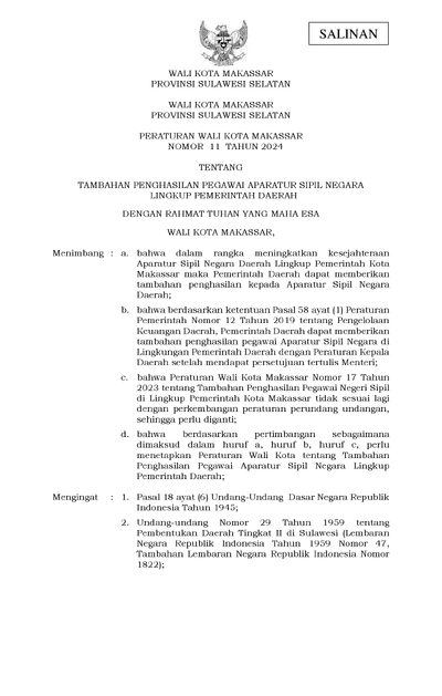 Peraturan Walikota Makassar Nomor 11 Tahun 2024 tentang Tambahan Penghasilan Pegawai Aparatur Sipil Negara Lingkup Pemerintah Daerah