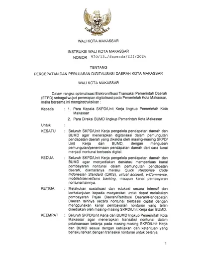Instruksi Walikota Makassar Nomor 970/ 13. I Bapenda/ III/ 2024 Tahun 2024 Tentang Percepatan dan Perluasan Digitalisasi Daerah Kota Makassar
