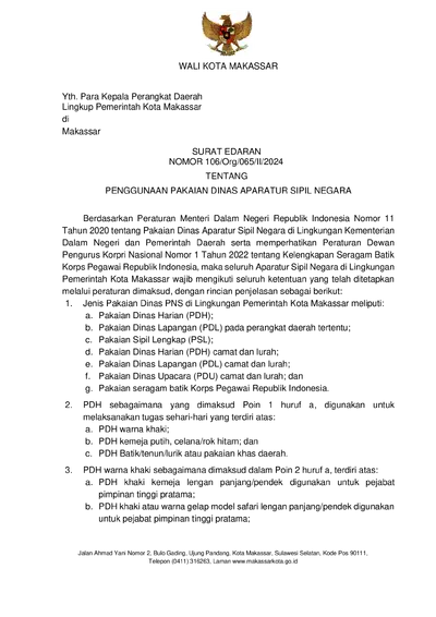 Surat Edaran Walikota Makassar Nomor 106/Org/065/II/2024 Tahun 2024 Tentang Penggunaan Pakaian Dinas Aparatur Sipil Negara