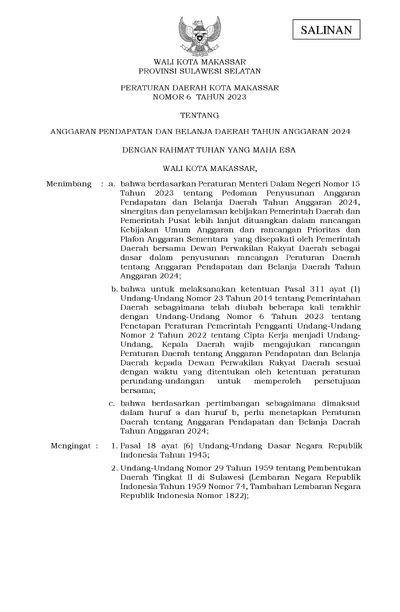 Peraturan Daerah Kota Makassar Nomor 6 Tahun 2023 Tentang Anggaran Pendapatan dan Belanja Daerah Tahun Anggaran 2024