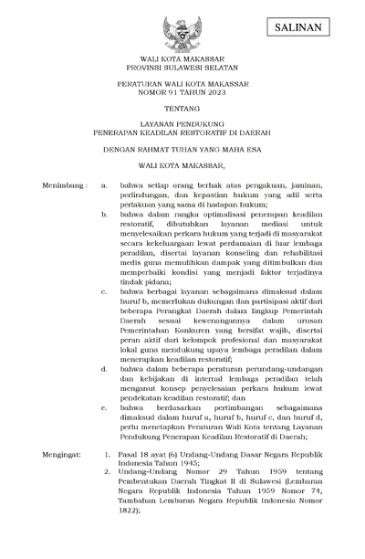 Peraturan Walikota Makassar Nomor 91 Tahun 2023 Tentang Layanan Pendukung Penerapan Keadilan Restoratif Di Daerah