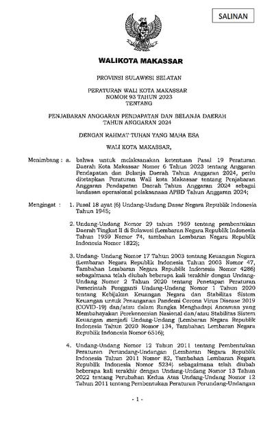 Peraturan Walikota Makassar Nomor 93 Tahun 2023 Tentang Penjabaran Anggaran Pendapatan Dan Belanja Daerah Tahun Anggaran 2024