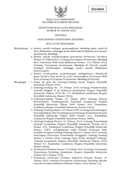 Peraturan Walikota Makassar Nomor 96 Tahun 2023 tentang Percepatan Penurunan Stunting