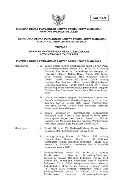 Keputusan DPRD Kota Makassar Nomor 42/ DPRD/188.45 Tahun 2023 Tentang Program Pembentukan Peraturan Daerah Kota Makassar Tahun 2024