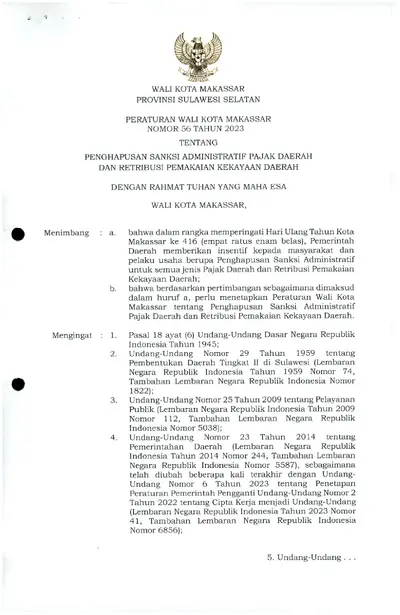 Peraturan Walikota Makassar Nomor 56 Tahun 2023 Tentang Penghapusan Sanksi Administratif Pajak Daerah Dan Retribusi Pemakaian Kekayaan Daerah