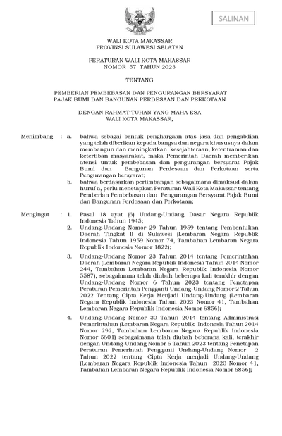 Peraturan Walikota Makassar Nomor 57 Tahun 2023 Tentang Pemberian Pembebasan Dan Pengurangan Bersyarat Pajak Bumi Dan Bangunan Perdesaan Dan Perkotaan