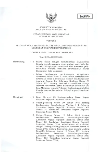 Peraturan Walikota Makassar Nomor 59 Tahun 2023 Tentang Pedoman Evaluasi Akuntabilitas Kinerja Instansi Pemerintah Di Lingkungan Pemerintah Daerah