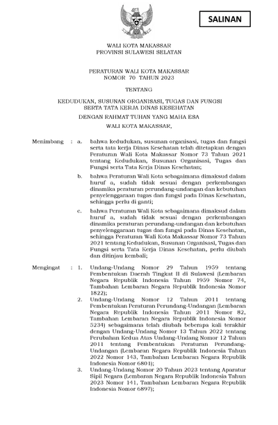 Peraturan Walikota Makassar Nomor 70 Tahun 2023 Tentang Kedudukan, Susunan Organisasi, Tugas Dan Fungsi Serta Tata Kerja Dinas Kesehatan