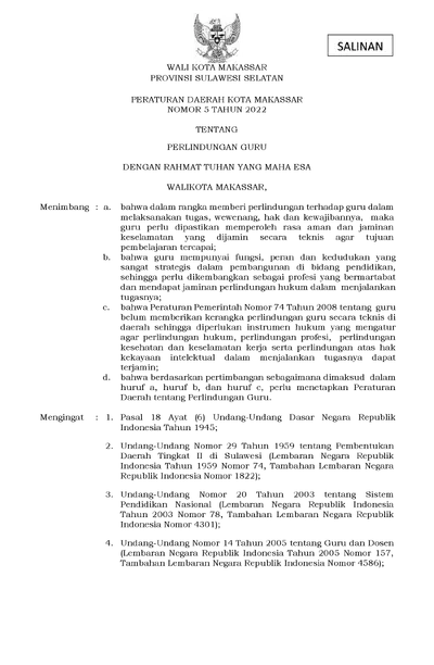 Peraturan Daerah Kota Makassar Nomor 5 Tahun 2022 Tentang Perlindungan Guru