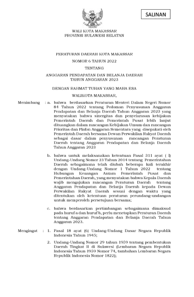 Peraturan Daerah Kota Makassar Nomor 6 Tahun 2022 Tentang Anggaran Pendapatan Dan Belanja Daerah Tahun Anggaran 2023