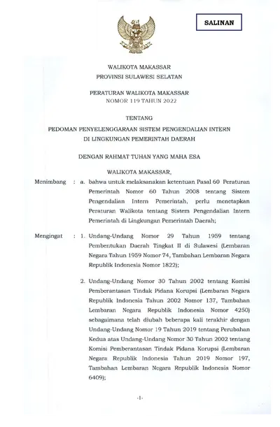 Peraturan Walikota Makassar Nomor 119 Tahun 2022 Tentang Pedoman Penyelenggaraan Sistem Pengendalian Intern Di Lingkungan Pemerintah Daerah
