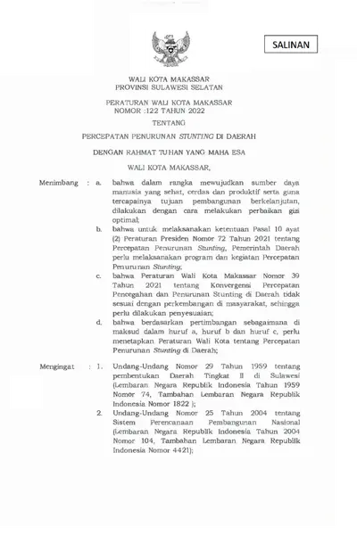 Peraturan Walikota Makassar Nomor 122 Tahun 2022 tentang Percepatan Penurunan Stunting Di Daerah