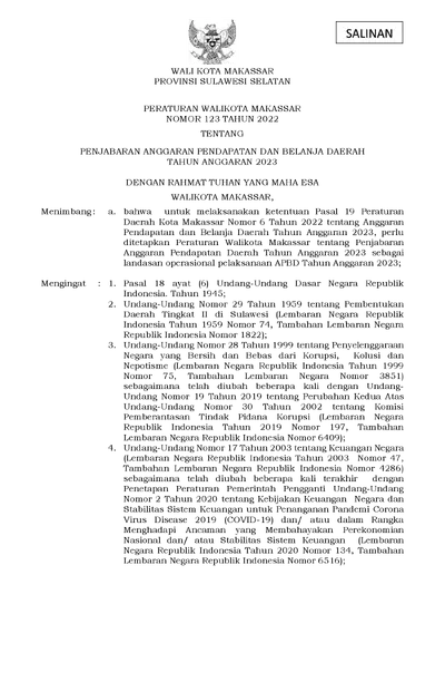 Peraturan Wali Kota Makassar Nomor 123 Tahun 2022 Tentang Penjabaran Anggaran Pendapatan Dan Belanja Daerah Tahun Anggaran 2023