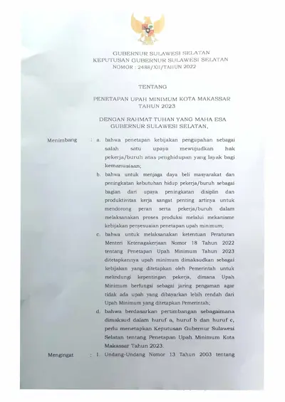 Keputusan Gubernur Makassar Nomor 2488 /XII/2022 Tentang Penetapan Upah Minimum Kota Makassar Tahun 2023
