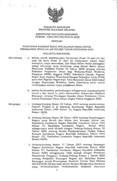 Keputusan Walikota Makassar Nomor 4295/090.900/tahun 2022 Tentang Penetapan Standar Biaya Perjalanan Dinas Untuk Perjalanan Dinas Dalam Negeri Tahun .............