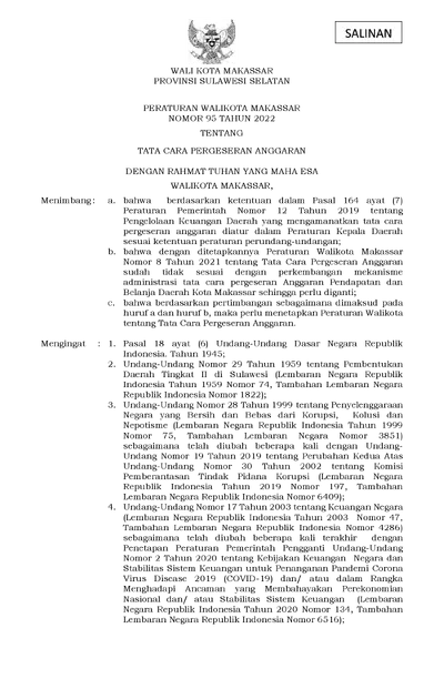 Peraturan Walikota Makassar Nomor 95 Tahun 2022 Tentang Tata Cara Pergeseran Anggaran