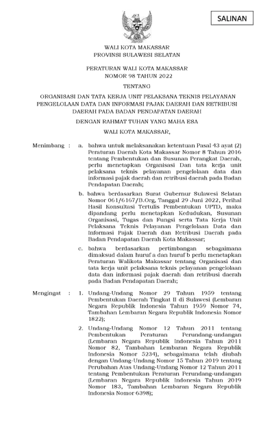 Peraturan Walikota Makassar Nomor 99 Tahun 2022 Tentang Organisasi Dan Tata Kerja Unit Pelaksana Teknis Pajak Daerah Dan Retribusi Daerah Pada Badan .............