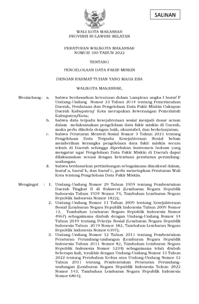 Peraturan Walikota Makassar Nomor 100 Tahun 2022 Tentang Pengelolaan Data Fakir Miskin