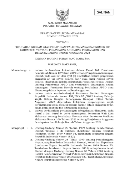 Peraturan Walikota Makassar Nomor 102 Tahun 2022 Tentang Perubahan Keenam Atas Peraturan Walikota Makassar Nomor 106 Tahun 2021 Tentang Penjabaran .............