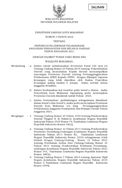 Peraturan Daerah Kota Makassar Nomor 3 Tahun 2022 Tentang Pertanggungjawaban Pelaksanaan Anggaran Pendapatan Dan Belanja Daerah Tahun Anggaran 2021