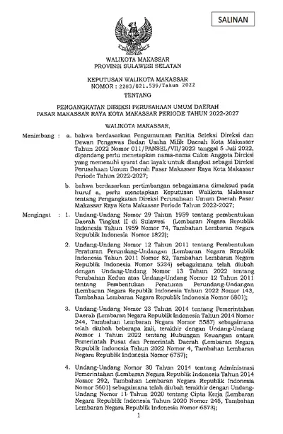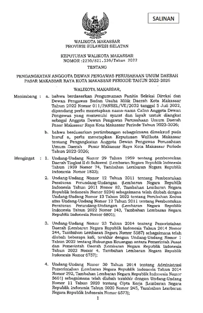 Keputusan Wali Kota Makassar Nomor 2230/821.539/Tahun 2022 Tentang Pengangkatan Anggota Dewan Pengawas Perusahaan Umum Daerah Pasar Makassar Raya .............