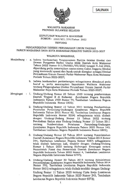 Keputusan Walikota Makassar Nomor 2282/821.539/tahun 2022 Tentang Pengangkatan Direksi Perusahaan Umum Daerah Parkir Makassar Raya Kota Makassar .............