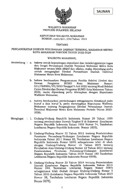 Keputusan Wali Kota Makassar Nomor 2285/821.539/tahun 2022 Tentang Pengangkatan Direksi Perusahaan Daerah Terminal Makassar Metro Kota Makassar .............