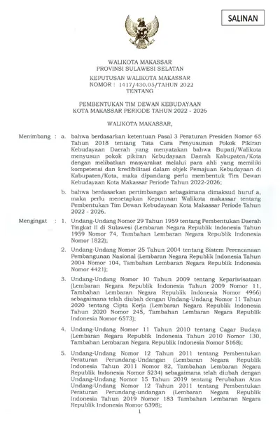 Keputusan Wali Kota Makassar Nomor 1417/430.05/Tahun 2022 Tentang Pembentukan Tim Dewan Kebudayaan Kota Makassar Periode Tahun 2022 - 2026