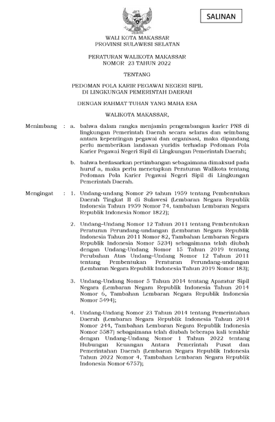 Peraturan Walikota Makassar Nomor 23 Tahun 2022 Tentang Pedoman Pola Karier Pegawai Negeri Sipil Di Lingkungan Pemerintah Daerah