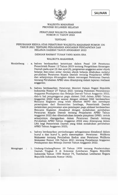 Peraturan Walikota Makassar Nomor 31 Tahun 2022 Tentang Perubahan Kedua Atas Peraturan Walikota Makassar Nomor 106 Tahun 2021 Tentang Penjabaran .............