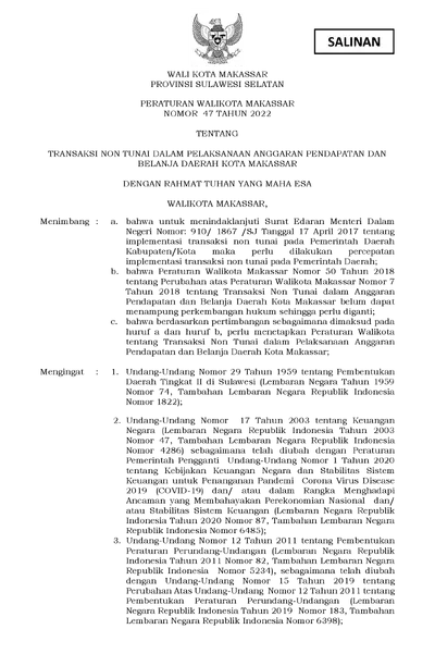 Peraturan Walikota Makassar Nomor 47 Tahun 2022 Tentang Transaksi Non Tunai Dalam Pelaksanaan Anggaran Pendapatan Dan Belanja Daerah Kota Makassar