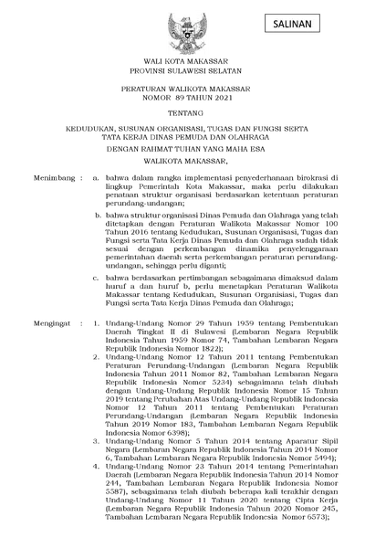 Peraturan Walikota Makassar Nomor 89 Tahun 2021 Tentang Kedudukan, Susunan Organisasi, Tugas Dan Fungsi Serta Tata Kerja Dinas Pemuda Dan Olahraga
