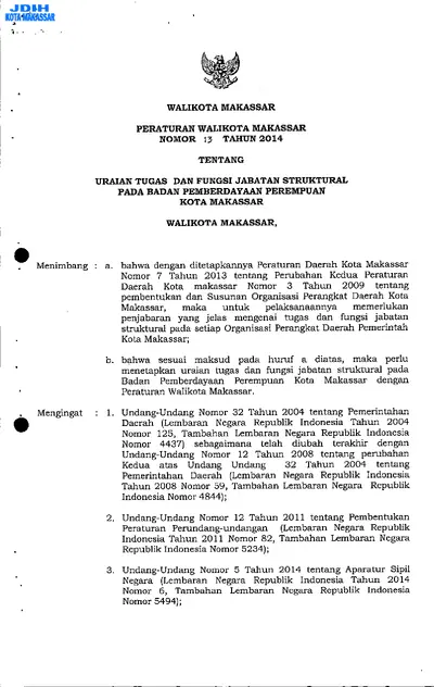 Peraturan Walikota Makassar Nomor 13 Tahun 2014 Tentang Uraian Tugas Dan Fungsi Jabatan Struktural Pada Badan Pemberdayaan Perempuan Kota Makassar