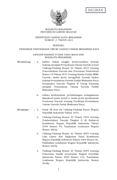 Peraturan Daerah Kota Makassar Nomor 2 Tahun 2021 Tentang Pendirian Perusahaan Umum Daerah Parkir Makassar Raya