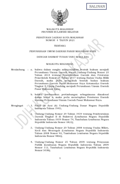 Peraturan Daerah Kota Makassar Nomor 4 Tahun 2021 Tentang Perusahaan Umum Daerah Pasar Raya