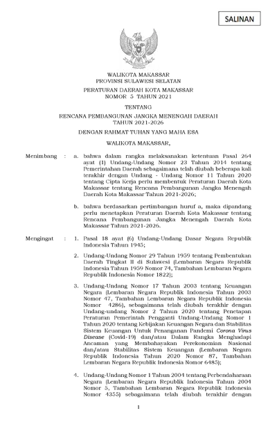 Peraturan Daerah Kota Makassar Nomor 5 Tahun 2021 Tentang Rencana Pembangunan Jangka Menengah Daerah Tahun 2021 - 2026