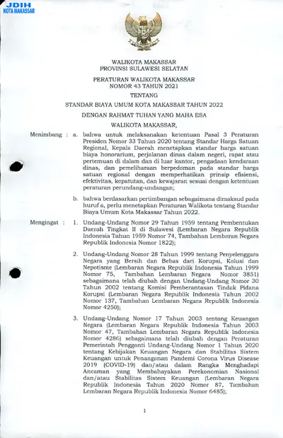 Peraturan Walikota Makassar Nomor 43 Tahun 2021 Tentang Standar Biaya Umum Kota Makassar Tahun 2022