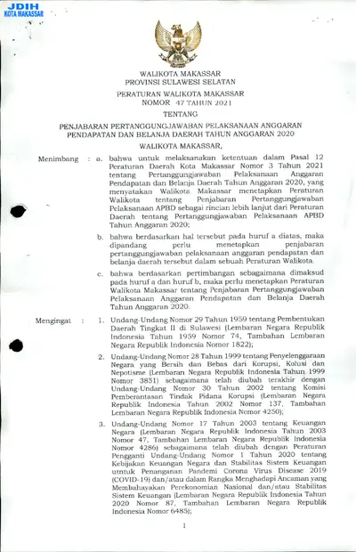 Peraturan Daerah Kota Makassar Nomor 3 Tahun 2021 Tentang Pertanggungjawaban Pelaksanaan Anggaran Pendapatan Dan Belanja Daerah Tahun Anggaran 2020
