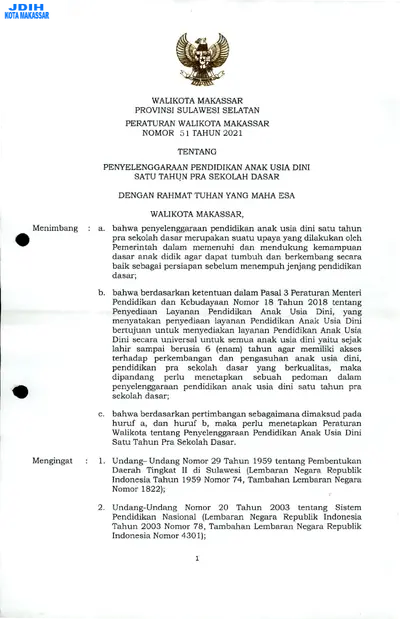 Peraturan Walikota Makassar Nomor 51 Tahun 2021 Tentang Penyelenggaraan Pendidikan Anak Usia Dini Satu Tahun Pra Sekolah Dasar