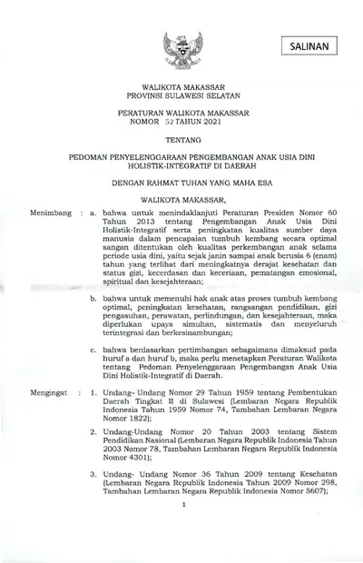 Peraturan Walikota Makassar Nomor 52 Tahun 2021 Tentang Pedoman Penyelenggaraan Pengembangan Anak Usia Dini Holistik-integratif Di Daerah
