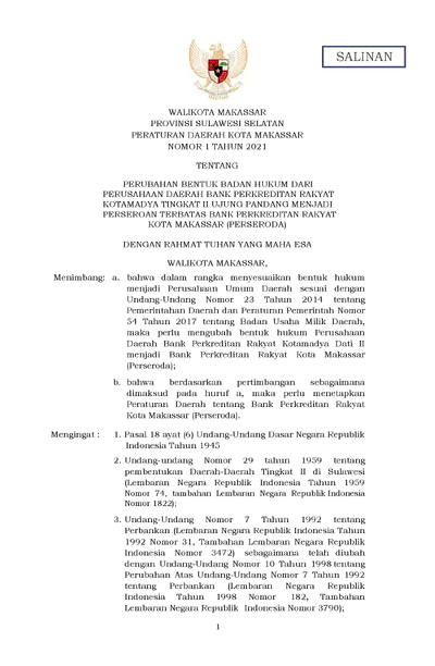 Peraturan Daerah Kota Makassar Nomor 1 Tahun 2021 Tentang Perubahan Bentuk Badan Hukum Dari Perusahaan Daerah Bank Perkreditan Rakyat Kotamadya .............