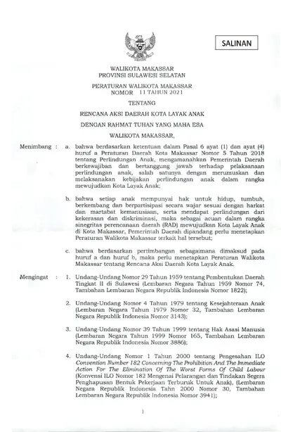 Peraturan Walikota Makassar Nomor 11 Tahun 2021 Tentang Rencana Aksi Daerah Kota Layak Anak