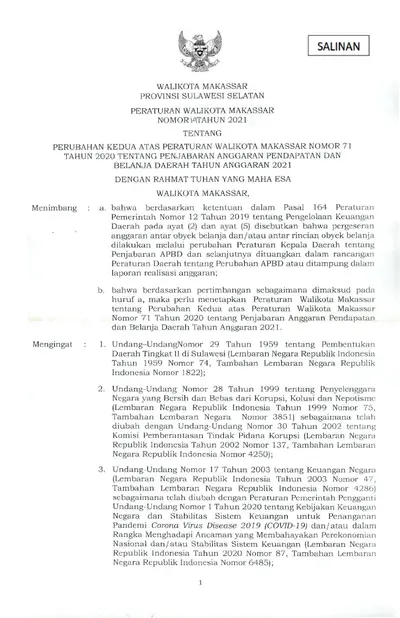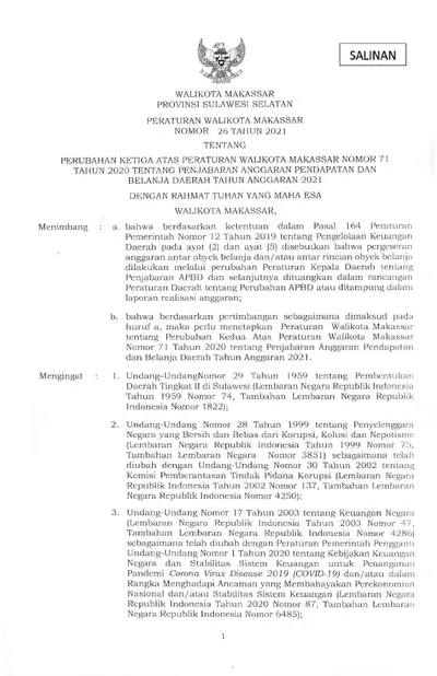 Peraturan Walikota Makassar Nomor 26 Tahun 2021 Tentang Perubahan Ketiga Atas Peraturan Walikota Makassar Nomor 71 Tahun 2020 Tentang Penjabaran .............